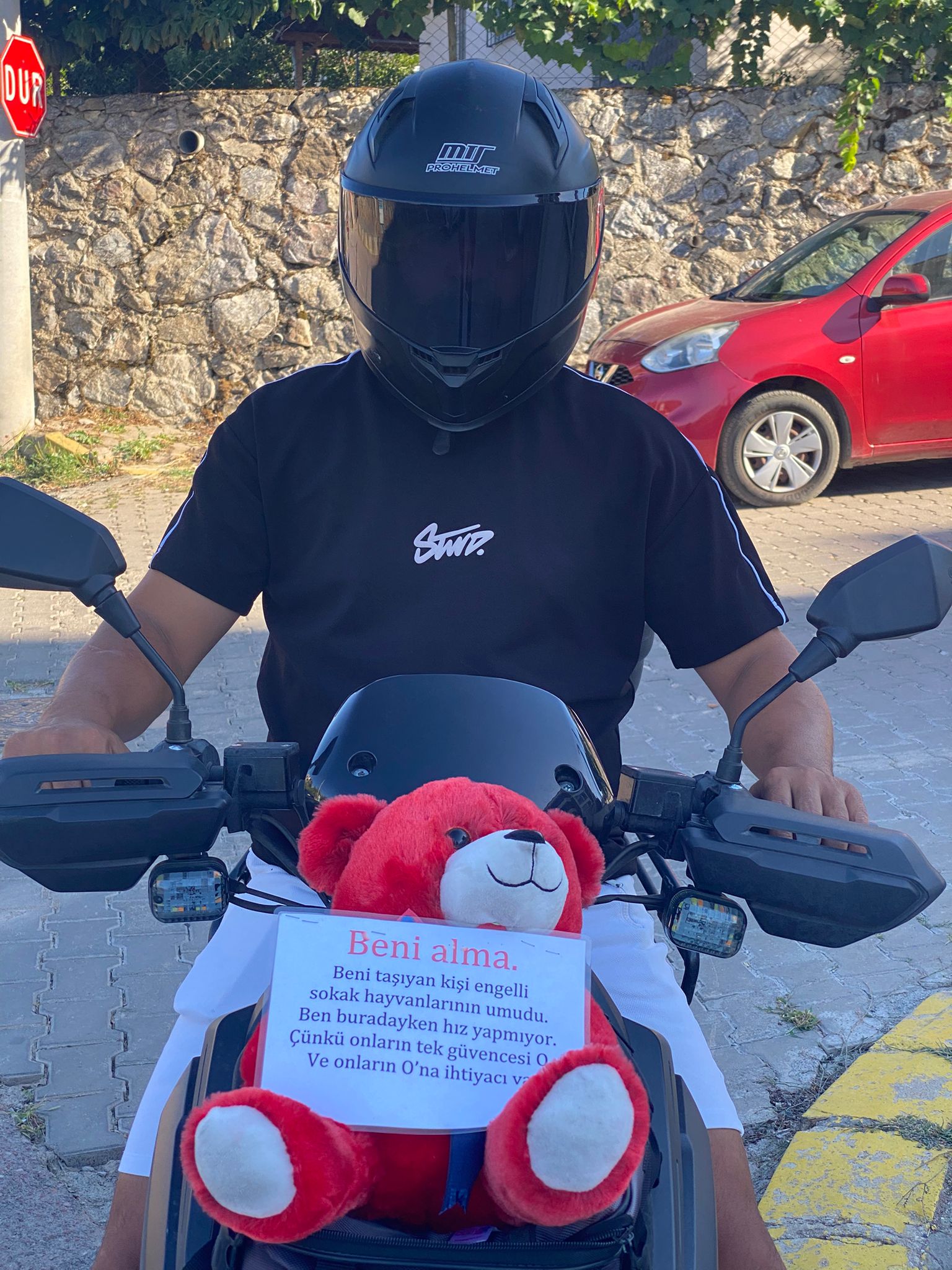 Kocaeli’de yaşayan hayvansever Ömer Ayhan, motosikletine taktığı kırmızı ayıcıkla ilham veren bir hikâyeye imza attı. Bu küçük oyuncak, evinde baktığı engelli hayvanların sembolü.